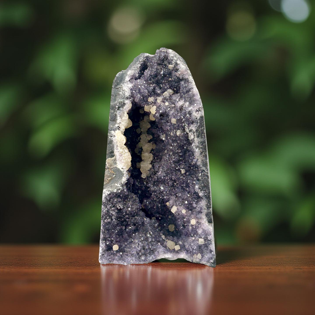 This stunning Uruguayan amethyst geode weighs 1,235 grams and measures 6 x 3.5 inches, featuring vibrant violet crystals accented by sparkling calcite formations. The natural contrast between the deep amethyst and creamy calcite creates a visually striking piece that draws the eye from every angle.