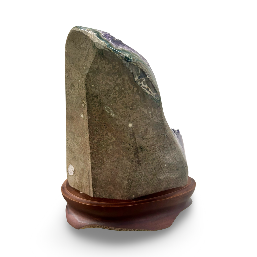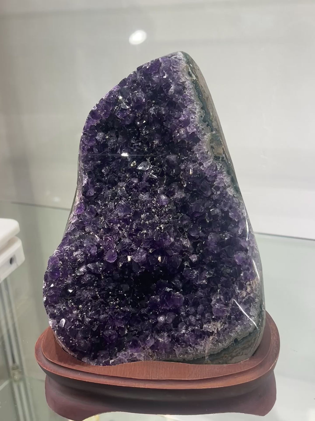 This elegant Amethyst cluster on a display base weighs 2,603 grams and measures 7 x 4.5 inches. Sourced from the mines of Brazil, it features rich violet crystal points that shimmer beautifully under the light, radiating both strength and serenity.