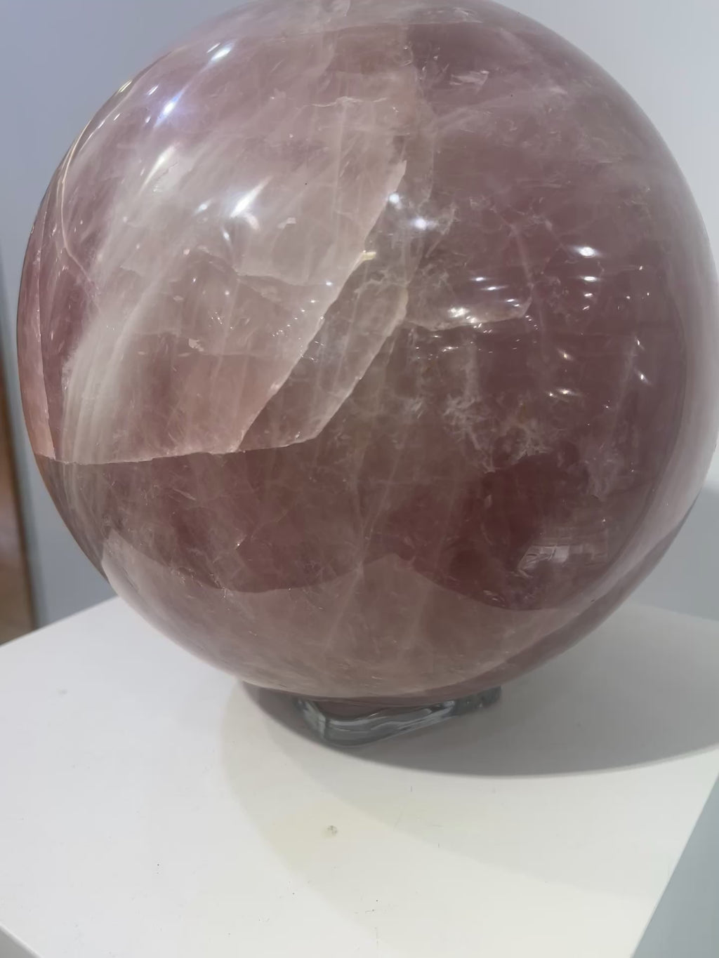 An extraordinary 85-pound masterpiece of pure Star Rose Quartz from Madagascar. Measuring an impressive 11 x 11 inches, this radiant sphere reveals a stunning six-rayed star when illuminated — a rare optical phenomenon caused by light reflecting off tiny rutile inclusions within the stone.