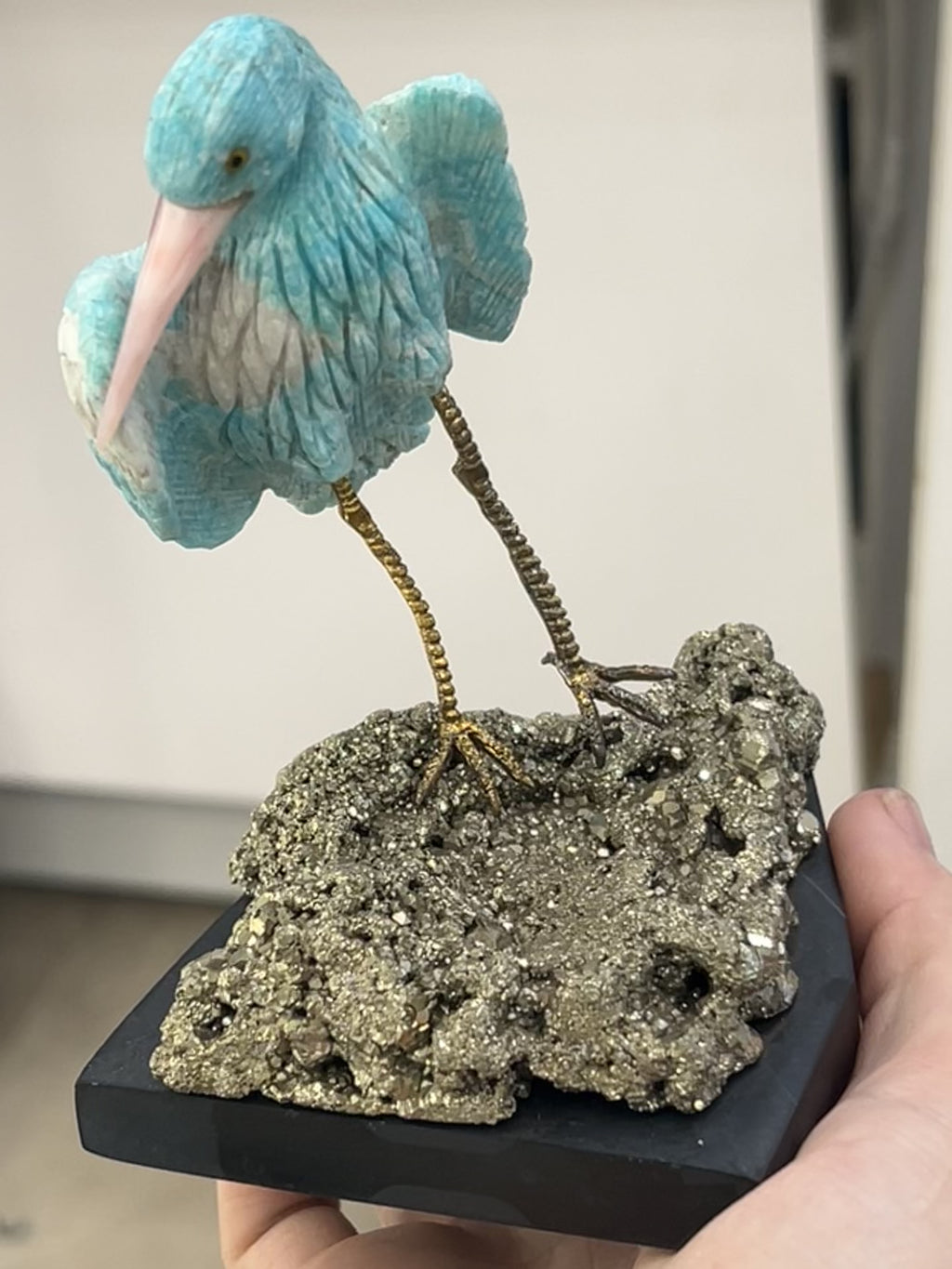 A truly unique combination of artistry and energy — this Amazonite bird on Pyrite base is both a statement of beauty and a powerful healing tool.